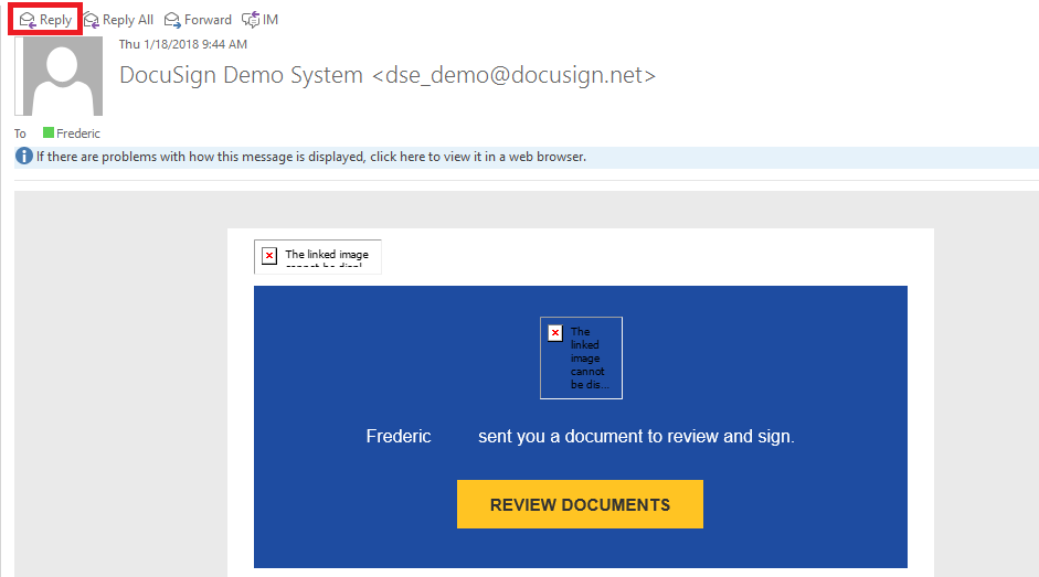 envelope.EmailSettings = settings;如果配置上述电子邮件设置,则当签名者收到邀请他启动签名仪式的DocuSign电子邮件时,如果他/她决定回复此电子邮件,则将不使用原始DocuSign发件人电子邮件,而是使用您配置的电子邮件。例如,我的"Frederic“帐户用于创建事务,因此发件人在DocuSign电子邮件中显示为"Frederic”。但是,当我决定回复时,它不会返回到"Frederic“,而是返回到我在信封中配置的用户: