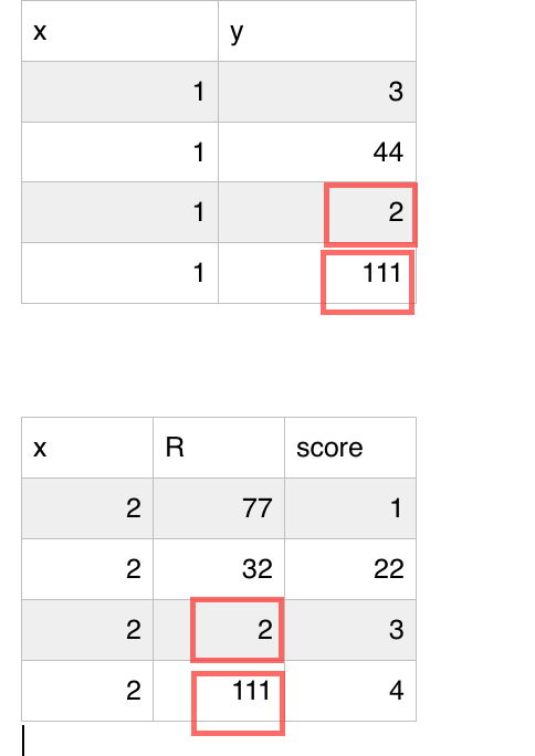 我需要将y列中的值从表一匹配到表二中的R列:请参见df1中的红色框中的两行与红色框中的df2中的两行匹配