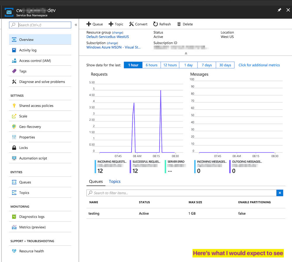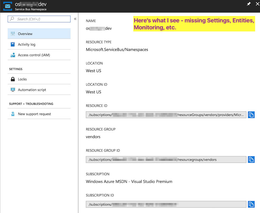 我错过了Azure Portal中的管理UI,用于几个Azure服务总线命名空间。我看不到任何实体、设置、监视等等,这些都是以前在旧的管理UI中创建的非常老的名称空间。在名称空间下创建的队列工作得很好--我只是看不见它们来管理它们。我不认为他们是用ACS创建的,但有可能是这样的。如果不与许多供应商协调重新发布公钥,我很难轻松地重新创建它们。有什么方法可以将Azure Portal重新附加到这些服务总线命名空间吗?