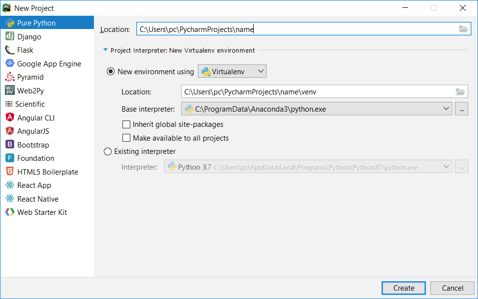 我最近在一台新的Windows电脑上安装了Anaconda。我没有管理Windows中安装的软件包的经验,但在Linux中。我用PyCharm创建了一个新项目,并选择使用Python3.7解释器,它与Anaconda附带的Python 3.6版本是分开安装的。现在,我希望能够在我的PyCharm项目中使用Anaconda模块,比如numpy或熊猫,即使用在PyCharmProjects文件夹中设置的虚拟环境。