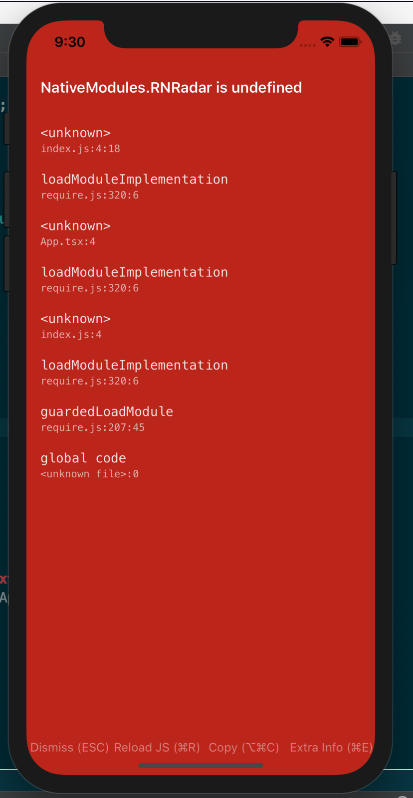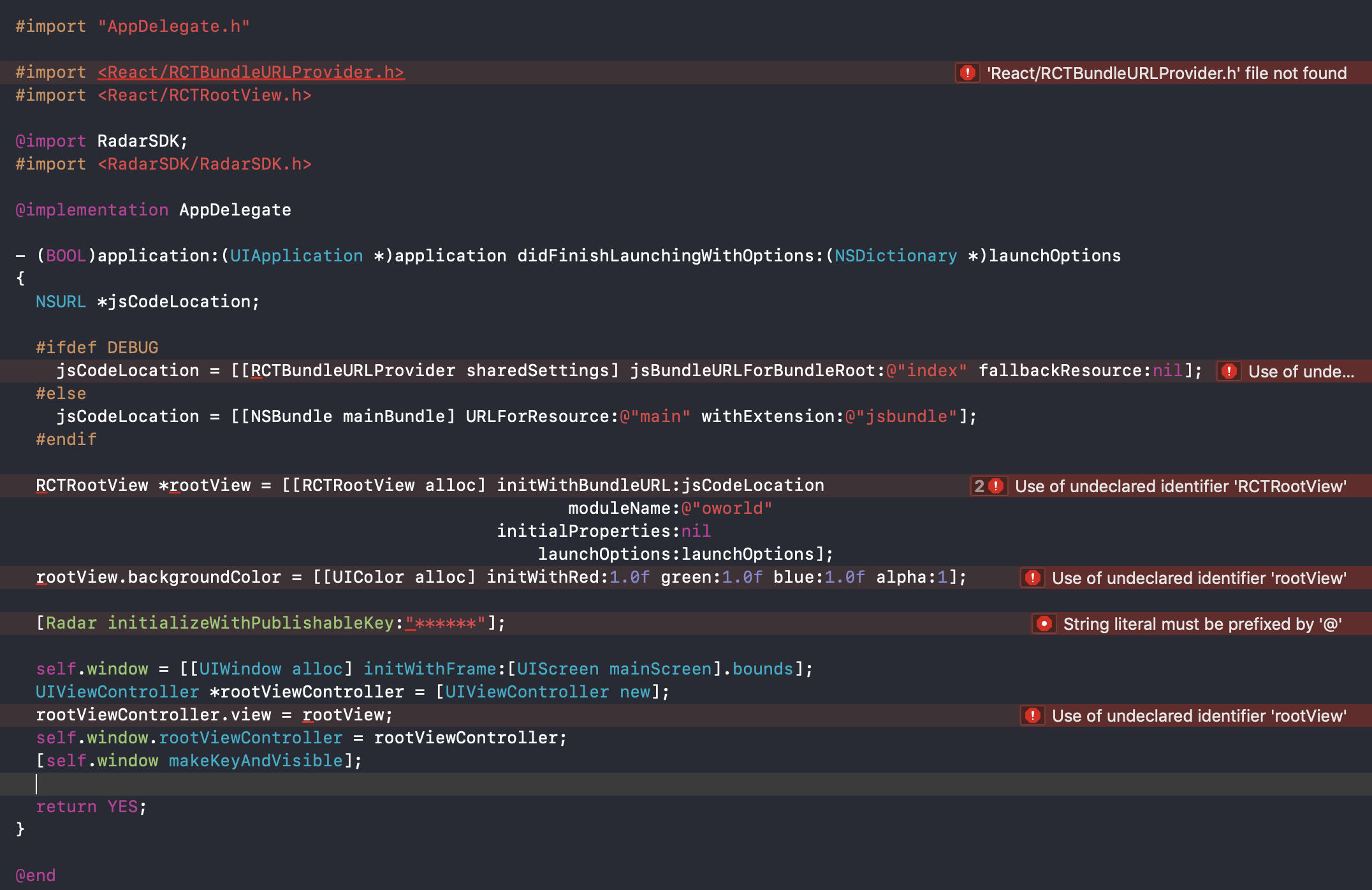 是的,这是非常奇怪的,因为本机甚至不应该编译;雷达initializeWithPublishableKey中的字符串文字:“key”应该失败,应该是Radar initializeWithPublishableKey:@"key“。我注意到本机构建可能会失败,但是工具链仍然将.app的旧版本推送到模拟器,值得再次检查您的构建是否成功。