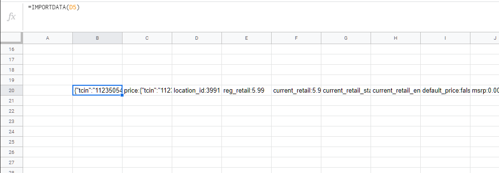 =VALUE(SUBSTITUTE(INDEX(IMPORTDATA("https://redsky.target.com/web/pdp_location/v1/tcin/"&RIGHT(A2,8)&"?pricing_store_id=0000&key="),,5),"current_retail:",""))我们给它一个输入(产品的URL ),它输出价格作为一个数字。这也适用于其他产品。然而,有时产品似乎有多重价格的问题,比如不同尺寸的选择等等。在这些情况下,IMPORTDATA返回的数组看起来有点不同,这意味着INDEX函数可能得不到正确的价格数据。可能有一个输出正确价格的解决方案,但这超出了这个答案的范围。