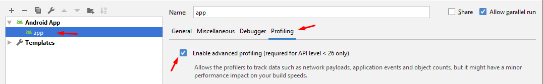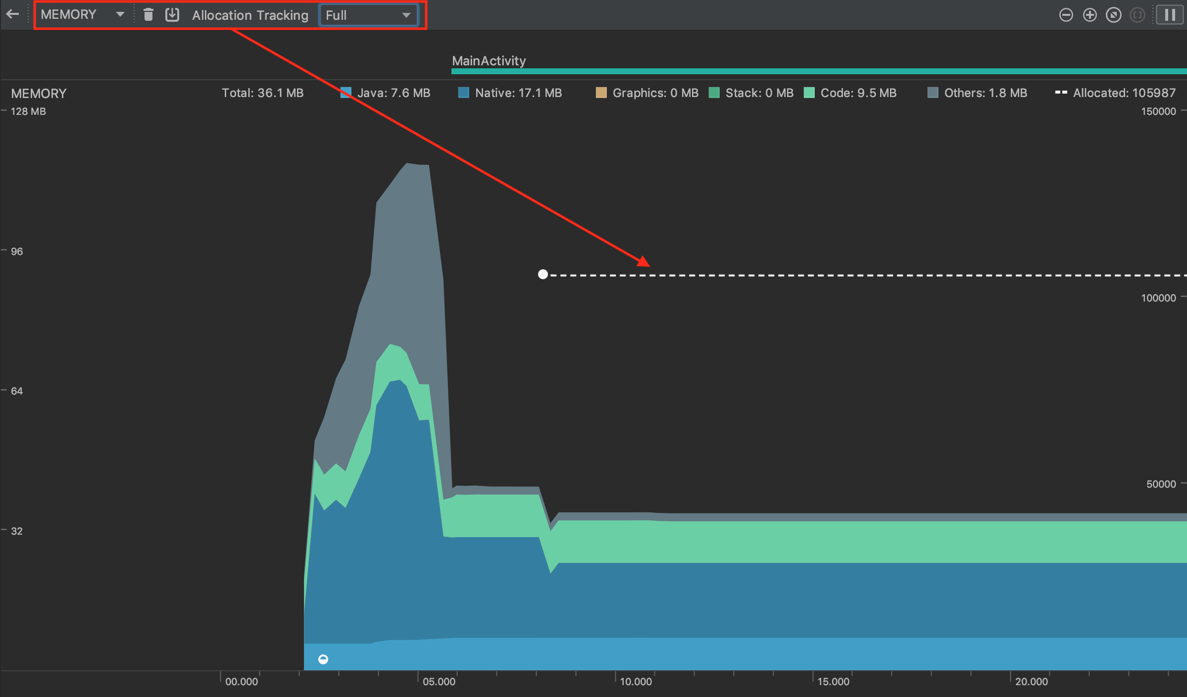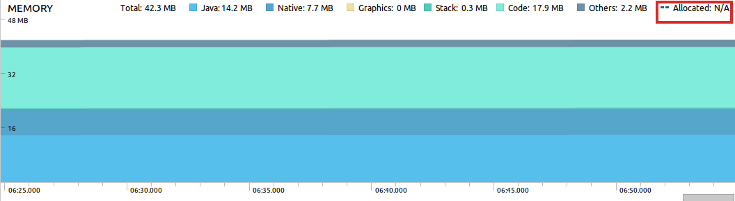 在真正的设备/模拟器上运行应用程序时,我无法查看为应用程序分配的内存,分析器显示分配为N/A