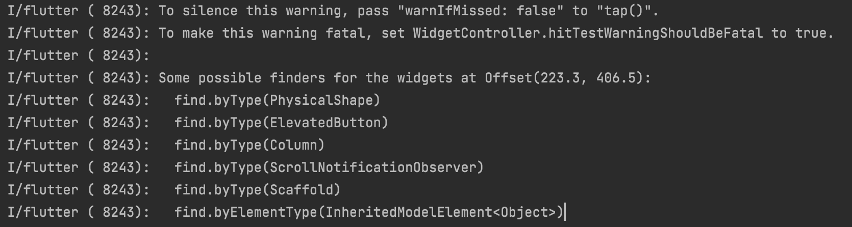 测试应该在模拟器或物理设备上运行,如果你使用的话。检查显示在第二个testWidgets()上的屏幕是否正确。点击预期的Widget将在屏幕上找到在模拟器中。这应该会显示如何在测试中找到被点击的Widget的日志。日志应该类似于以下内容
