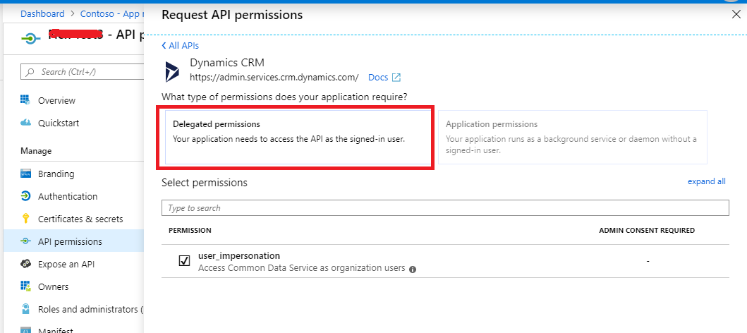 如果您的应用程序是允许通过身份验证的用户执行操作的客户端,则必须将应用程序配置为具有组织用户委托权限的Access Dynamic365。