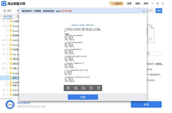 风云恢复大师是一款功能齐全、使用方便的免费数据恢复手机软件。它可以恢复各种类型的文档,包括照片、短视频、声频、文本文档等。该软件提供各种文件目录,包括NTFS、FAT32、ext2/ext3/ext4等。它可以在Windows或Mac系统下轻松完成。使用优秀的算法和技术,扫描计算机硬盘并找到丢失的文档,以确保数据的完整性和可靠性。