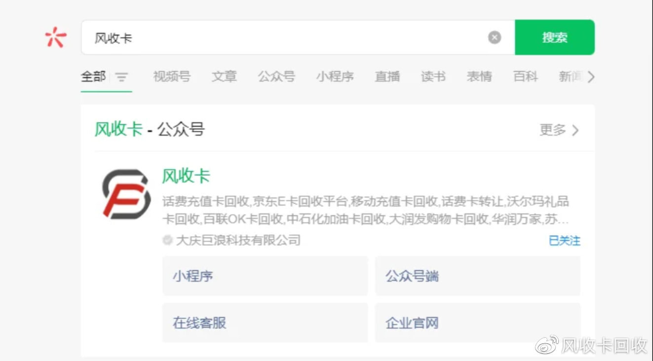第一步:打开微信搜索风收卡公众号;