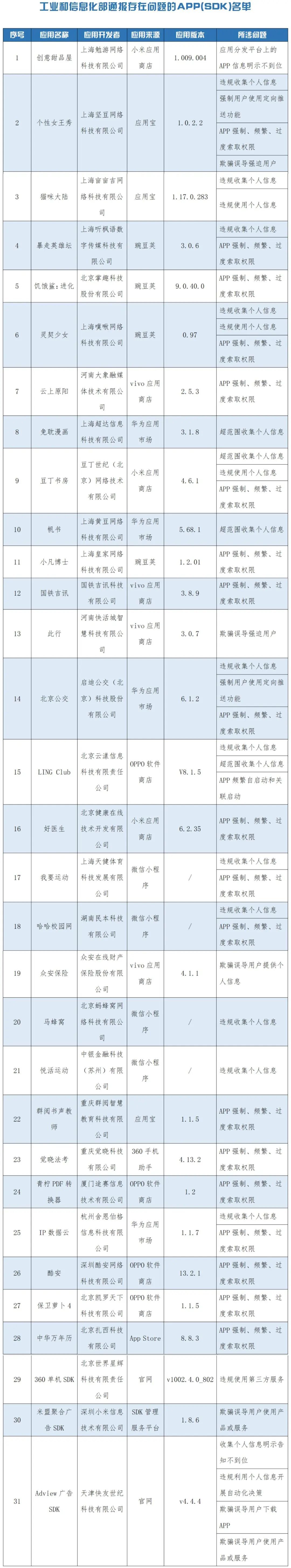 工业和信息化部高度重视用户权益保护工作,依据《中华人民共和国个人信息保护法》《中华人民共和国网络安全法》《电信条例》《电信和互联网用户个人信息保护规定》等法律法规,持续开展App侵害用户权益专项整治行动。近期,工业和信息化部组织第三方检测机构对群众关注的休闲娱乐、实用工具、出行服务等移动互联网应用程序(App)及第三方软件开发工具包(SDK)进行检查。发现31款App(SDK)存在侵害用户权益行为,现予以通报。