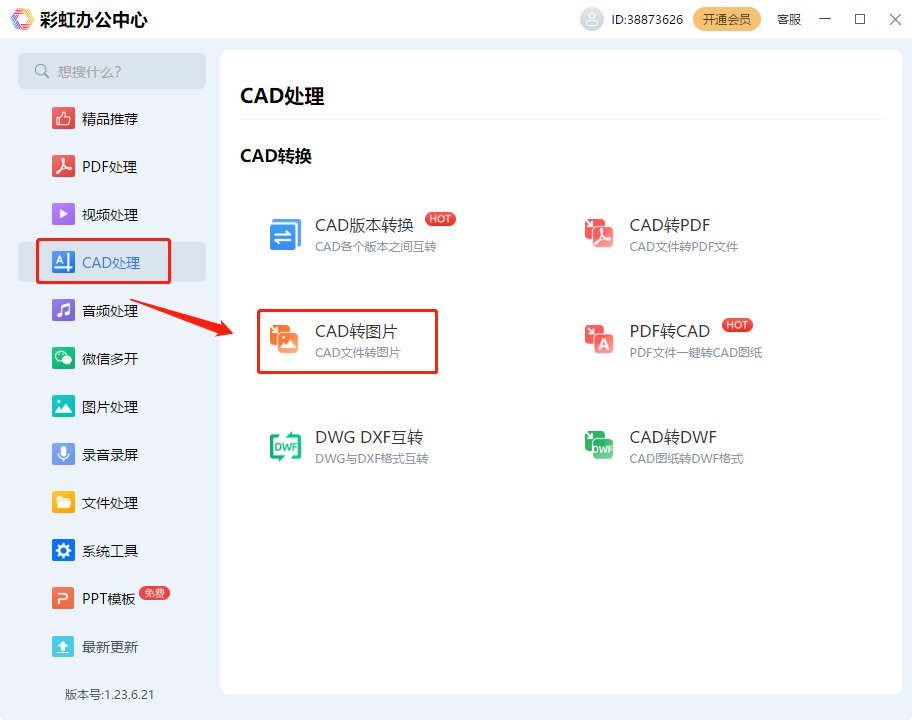 第一步,在浏览器中找到官网下载最新版本的《彩虹办公》,点击打开选择左侧的【CAD处理】这个功能,可以使用里面的【CAD转图片】功能;