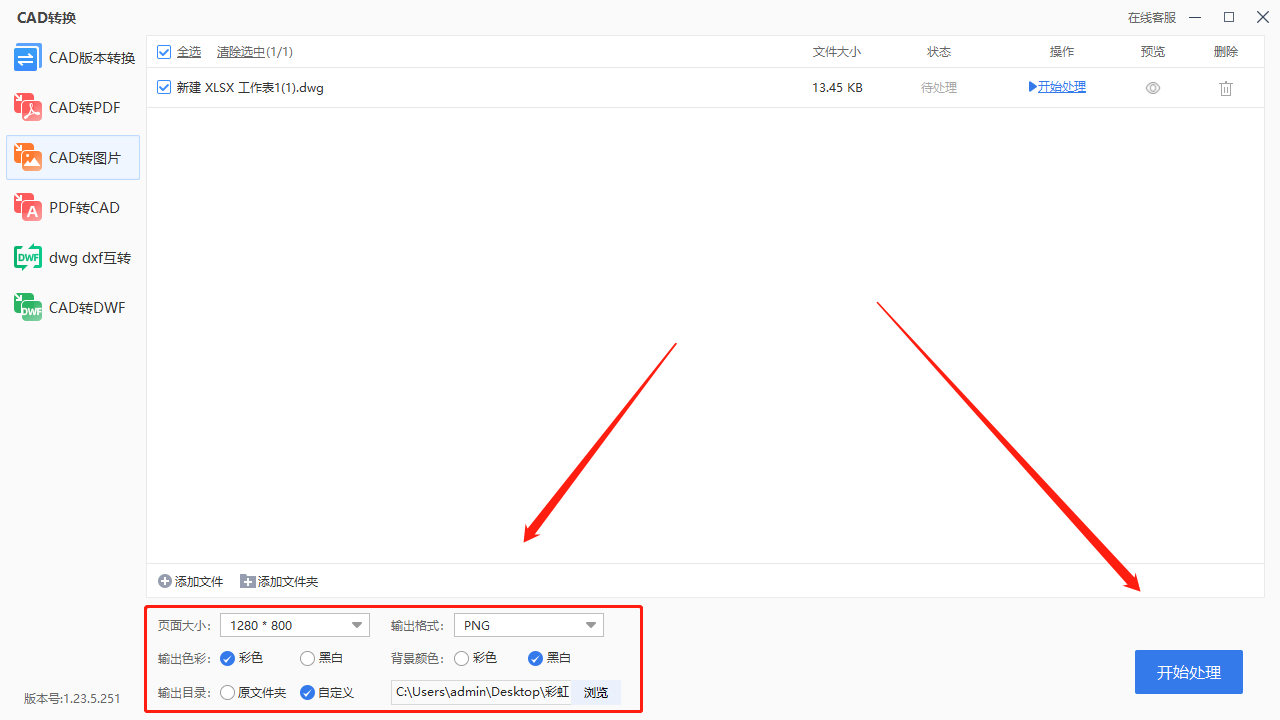 最后,在弹出的对话框中,点击【添加文件】将需要转换的cad文件直接导入,可以将【品质】拉到1200也就是最高,点击【开始】即可。