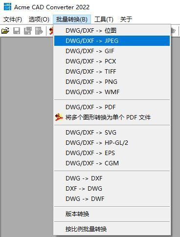然后,点击菜单栏目中的【批量转换】,在这个功能里面选择【DWG/DXF-->JPEG】,