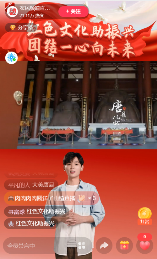 2023年8月1日,在“红色文化助振兴,团结一心向未来"的大型融媒系列活动中对唐县的红色文化、著名旅游景点、特色农产品进行了专场直播介绍,直播间间在农民频道新媒体多平台官方账号同步转播。