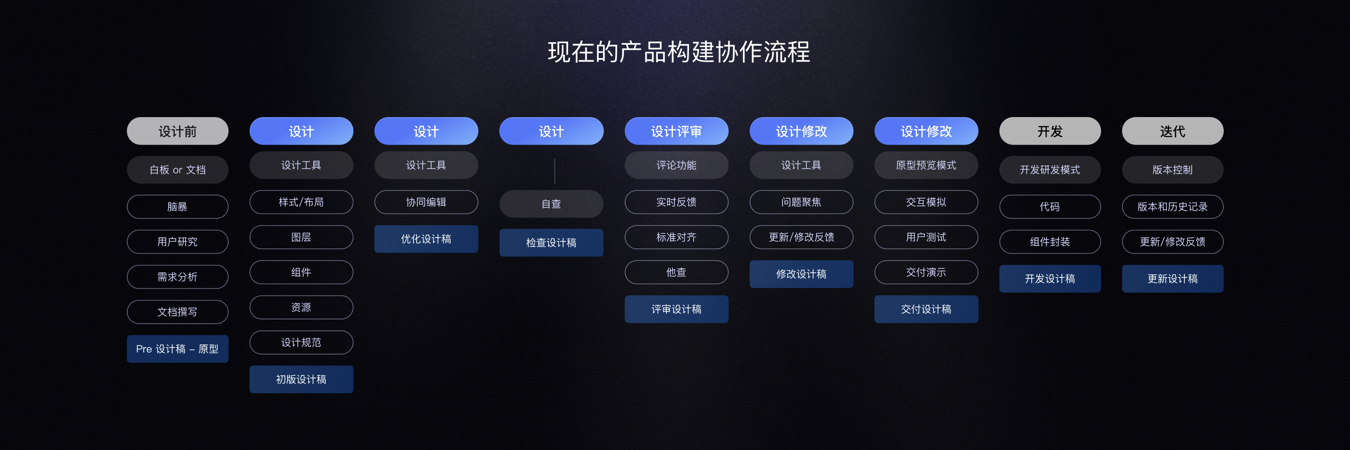 在传统工作中,产研设工作中的核心流程始终是围绕着设计稿开展的,产品原型是一个pre-设计稿,设计师基于原型进行设计,开发再基于设计稿进行开发,各个角色都专注于自己的领域,用各自的语言展开工作。