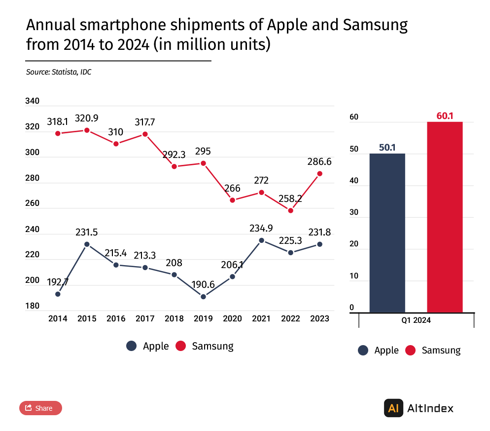 IT之家 5 月 17 日消息,数据投资分析平台 AltIndex 近日基于 IDC 公布的数据,表示 2014-2024 过去 10 年期间,三星智能手机的出货量接近 30 亿台,比苹果多出 7 亿台,高出 33%。