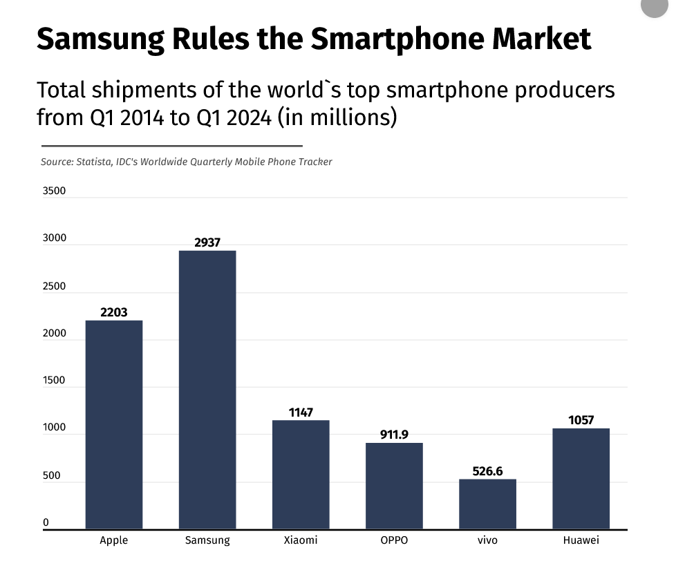 2024 年第一季度,三星在全球智能手机市场的占有率为 20.8%,低于 2014 年第一季度的 30.7%。