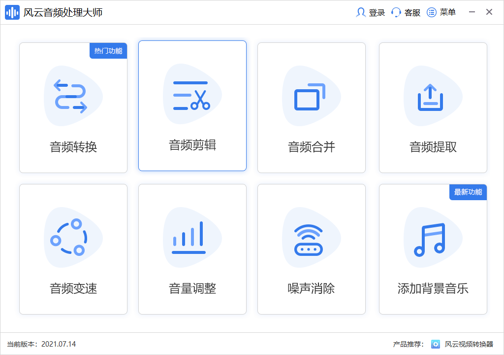 首先,你需要在你的电脑上安装并启动风云音频处理大师软件。打开软件后,你会看到首页上有很多音频处理的功能,包括音频转换、音频剪辑、音频合并、音频变速等。