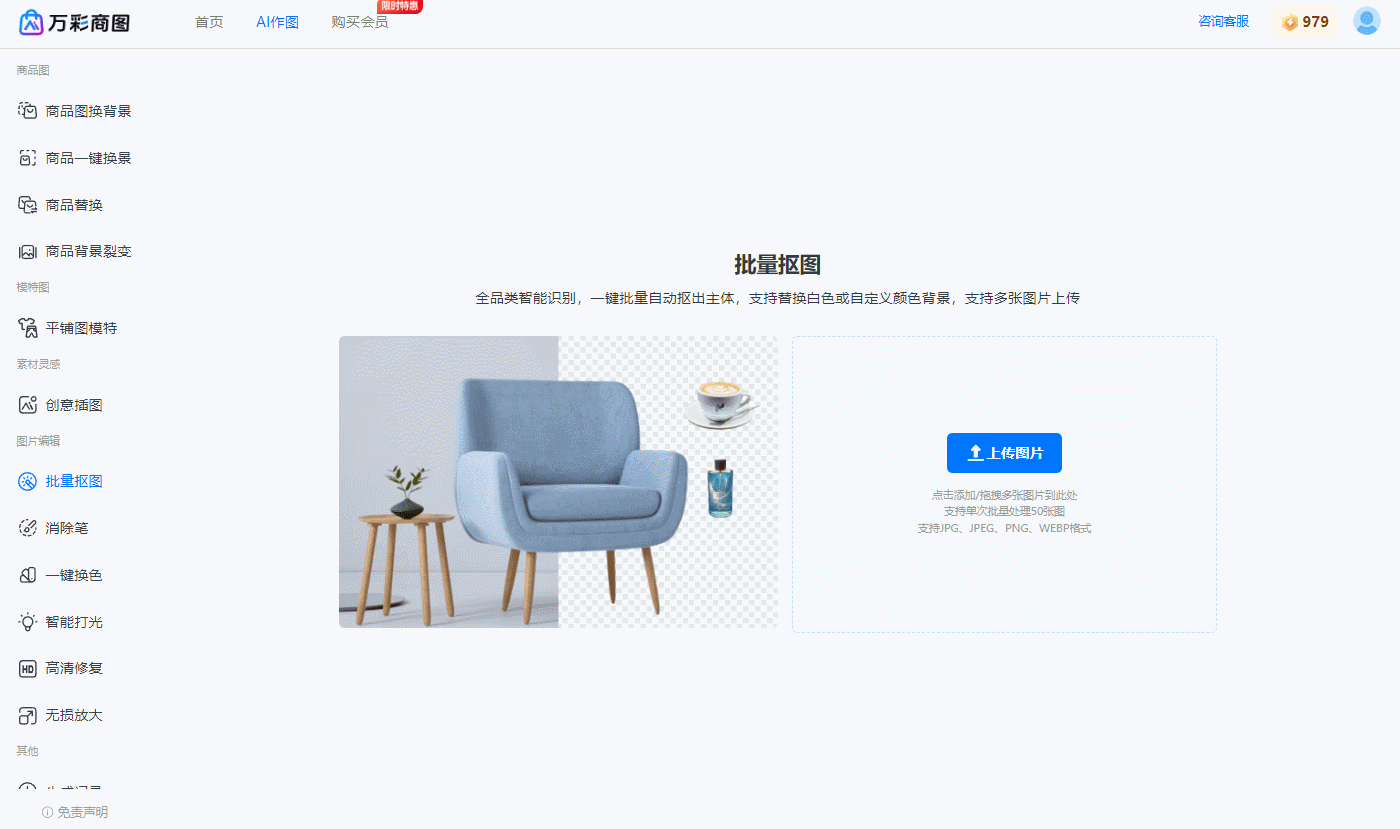 第一步,当然是把你要处理的产品图片上传到万彩商图上啦。这个操作很简单,点几下鼠标就搞定了。记得上传的图片要清晰哦,这样生成的主图才会更美观。
