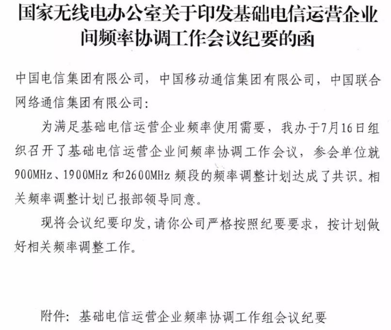 ——会议主题:目前使用的900MHz、1800MHz和2600MHz频段的频率调整。