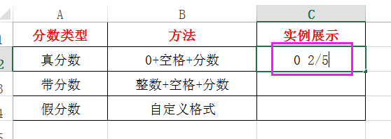 第一类:真分数的输入。我们需要在所在单元格输入“0+空格+分数”,具体如下图所示: