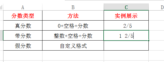 第二类:带分数的输入。我们需要在所在单元格输入“整数+空格+分数”即可,具体如下图所示: