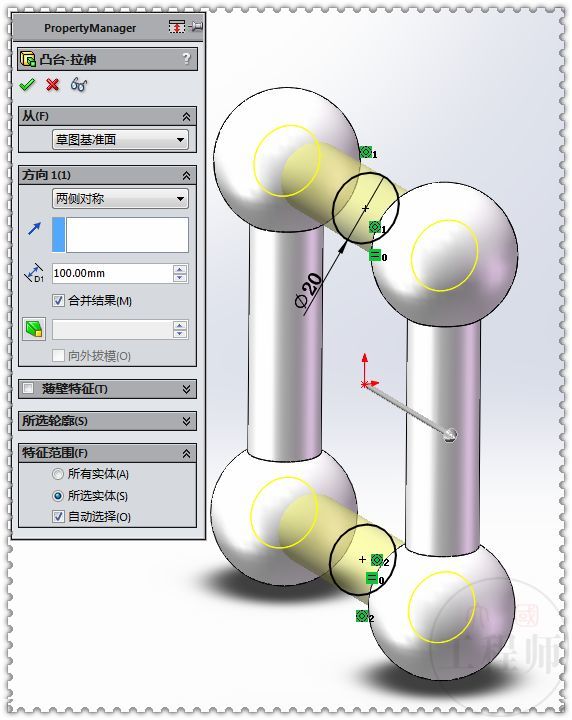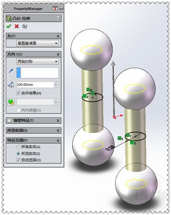 4.在上视面画两个圆,直径:20 ,两侧对称拉伸:100 。
