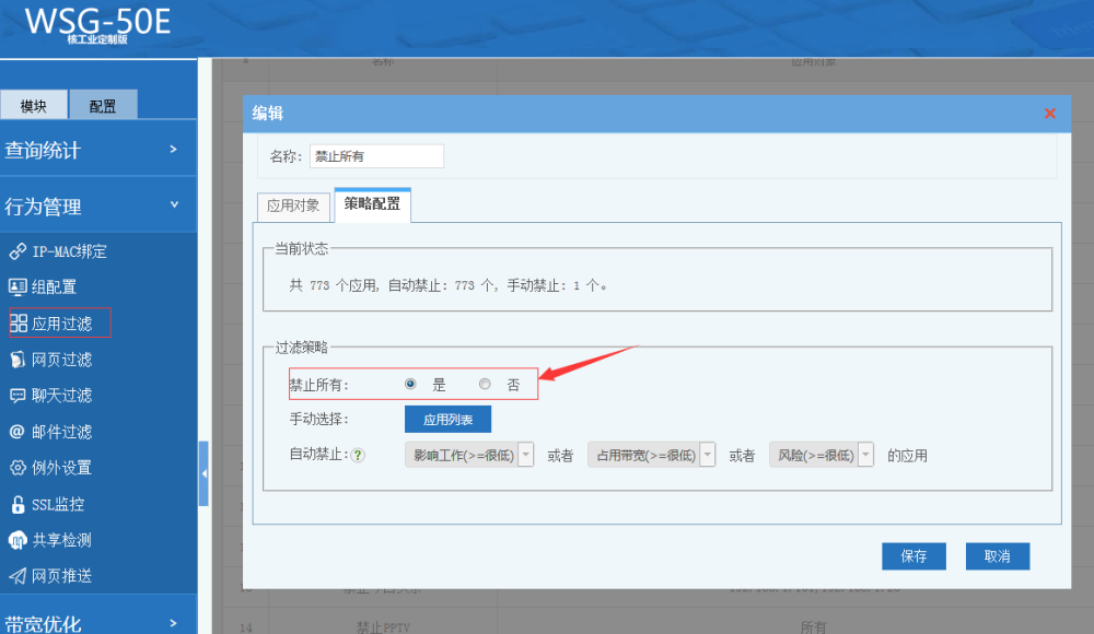 有些公司为了安全需要,只允许使用微信等指定软件,同时屏蔽所有的其他网站和软件。这样的管理需求,必须要用专业的上网行为管理产品才可以实现。以我司的WSG上网行为管理为例,只需要两条行为管理规则,即可实现该功能。配置的思路是“应用过滤屏蔽所有+例外设置开通部分应用”这两者结合的方式。下面是具体配置的步骤介绍: