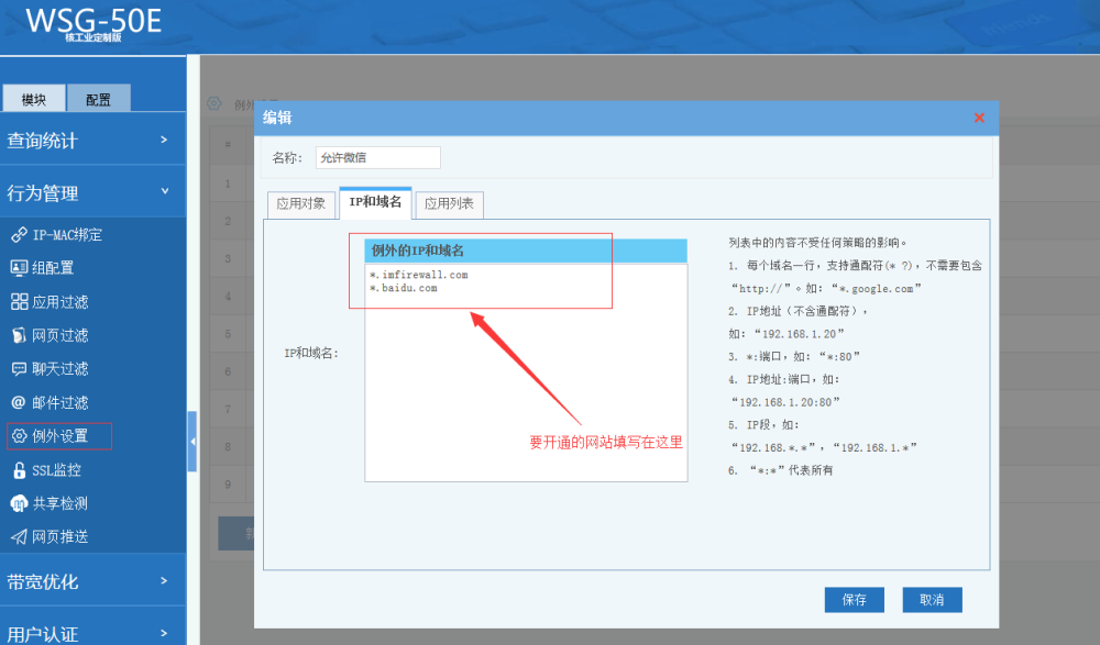 在“IP和域名”里面填写要放行的网站、IP或者端口。如图: