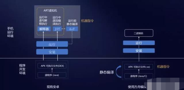 在介绍方舟编译器前不得不先说说安卓操作系统。都知道在安卓系统上面运行应用程序有一个通病,那就是效率低。对此,安卓也经过多个版本的迭代,做了多次改善,但都无法达到最佳效果。安卓应用程序是运行在java虚拟机上面的,程序在运行前,需要先将代码编译为机器可识别的指令,然后再执行。就会出现在程序运行前机器有较多的工作要做,所以就存在效率低的问题了。而华为方舟编译器的优势在于,绕过了java虚拟机。方舟编译的的做法是,将编译过程放到了应用程序开发端,也就是说,当开发者完成程序开发后,打包前就将程序编译为机器可识别的语言。然后将应用商家到应用商店,用户安装的就是已编译好的程序了,打开即可直接运行。