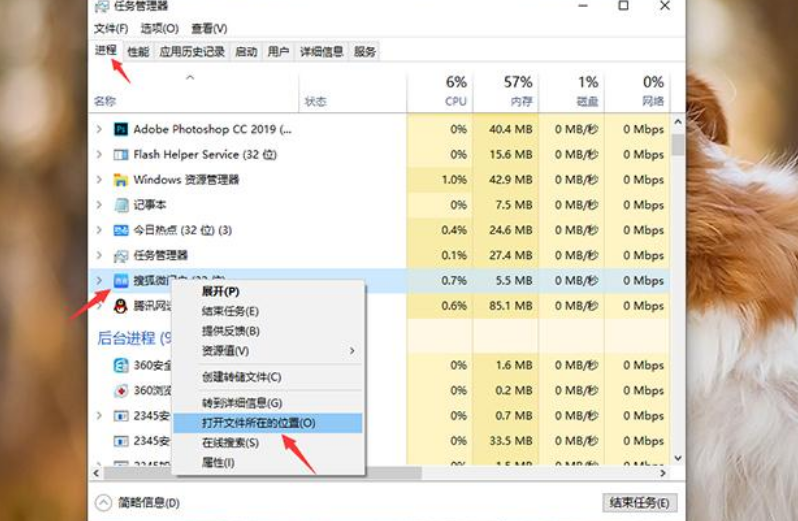 1、等到电脑上跳出广告弹窗的话,先不要着急关闭,在键盘上按下【Ctrl+Shift+Esc】,调出【任务管理器】。在【进程】-【应用】下方,找到与桌面上相对应的弹窗广告名称,鼠标右击选择【打开文件所在的位置】。然后在名称后面添加【.bak】,这样就瘫痪掉了广告程序。