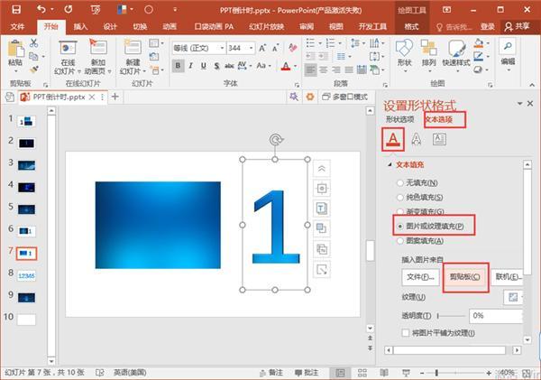 调整好图片和数字的大小,复制图片,然后选中数字,点击右键在菜单栏中选择【设置文字效果格式】,然后我们在右边的弹窗中点击【文本选项】——【文本填充与轮廓】——【图片或纹理填充】——【剪贴板】,效果如图~其他几个数字也这样设置即可~