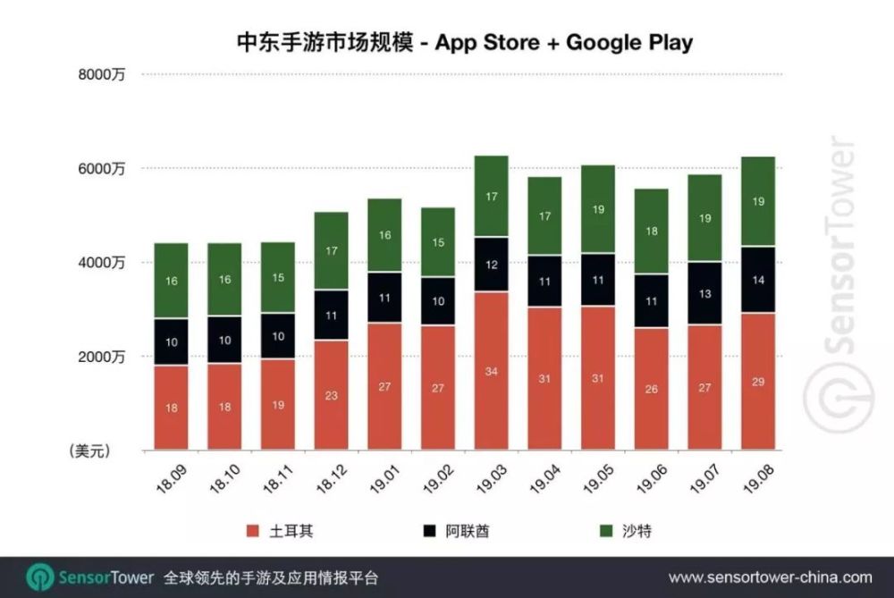 土耳其、阿联酋和沙特作为中东地区移动游戏的三大主力市场,不仅收入成绩不俗,市场发展也很迅速,于2019年8月三个市场手游总收入达到6200万美元,较2018年9月4400万美元上涨40.9%。
