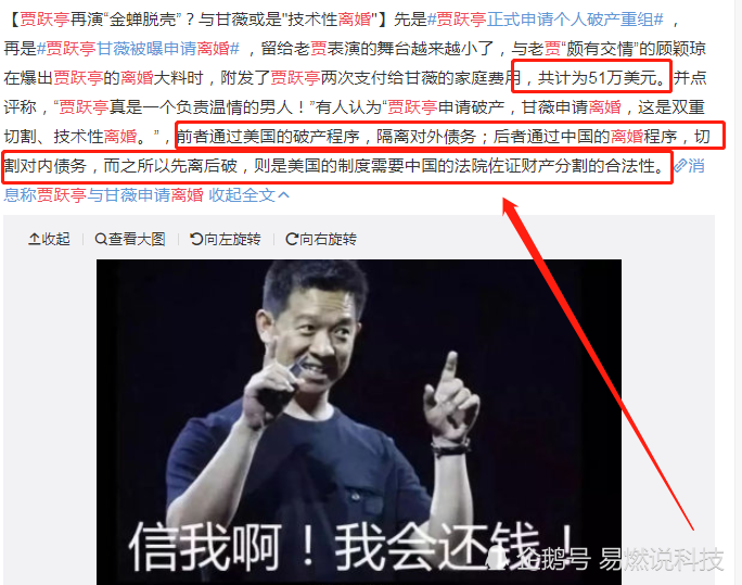 贾跃亭日前高调宣布要离婚,也已经申请做了离婚协议。贾跃亭会给妻子51万美元的抚养费。不得不说在欠着这么多钱的情况下,贾跃亭还能拿出这么多钱,真的是还蛮厉害的。但这一场离婚却让人们看出了不寻常的味道,贾跃亭的真实目的是什么呢?