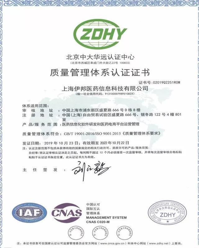 近日,上海伊邦医药信息科技有限公司(简称伊邦健康)通过了《质量管理体系》国家标GB/T19001-2016/ISO9001:2015的认证,获得了由北京中大华远认证中心颁发的《质量管理体系认证》证书,这意味着伊邦健康项目管理系统均已达到国际化标准,在质量管理领域获得到了重要认可,综合竞争力得到进一步提升。