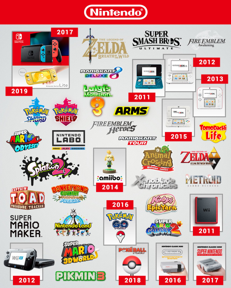 任天堂官方推特公布的图片用游戏logo纪念这十年来推出的作品,其中包括全世界销量最高的格斗游戏《任天堂明星大乱斗特别版》、2017年年度游戏《塞尔达传说:旷野之息》等大卖游戏,这十年中任天堂发售的主机硬件也进行了回顾,像是2011年发售的去掉光驱的Wii等。这个十年里,对于任天堂最大的改变就是对待手机游戏的态度更加认真,《火焰纹章:英雄》放在画面中间的醒目位置就是最好的证明。