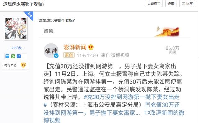那么你对这位"花费30万没得到网游排行第一,而离家出走"的男子怎么看待呢?你觉得他玩的是哪款游戏呢?