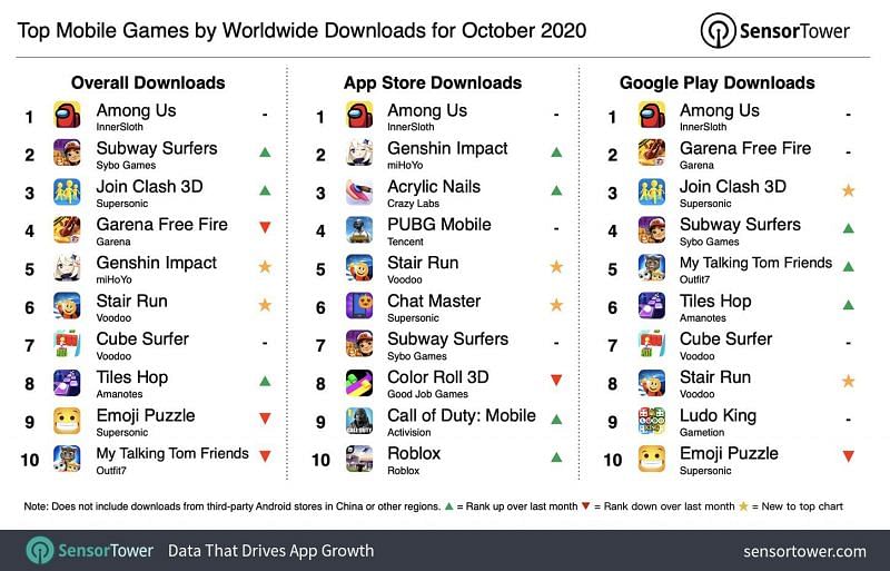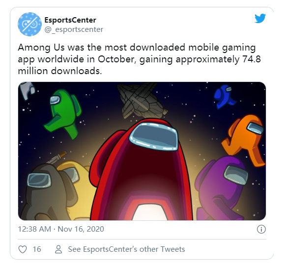 SensorTower最近发布的数据显示,《 Among US 》是2020年10月下载次数最多的游戏。