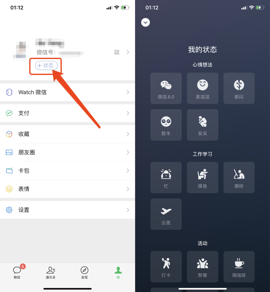 在 我 页面资料页面中,新增「我的状态」,点进去后就会有很多状态,包括心情想法、工作学习、活动等,你可以选择一个适合你的状态。