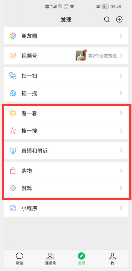 默认情况下,微信的发现页会有很多功能,如:朋友圈、视频号、扫一扫、看一看、购物、游戏等等,可是有些功能我们基本上用不到,可是它们会不断地向我们推送,这样就会占用大量的内存。