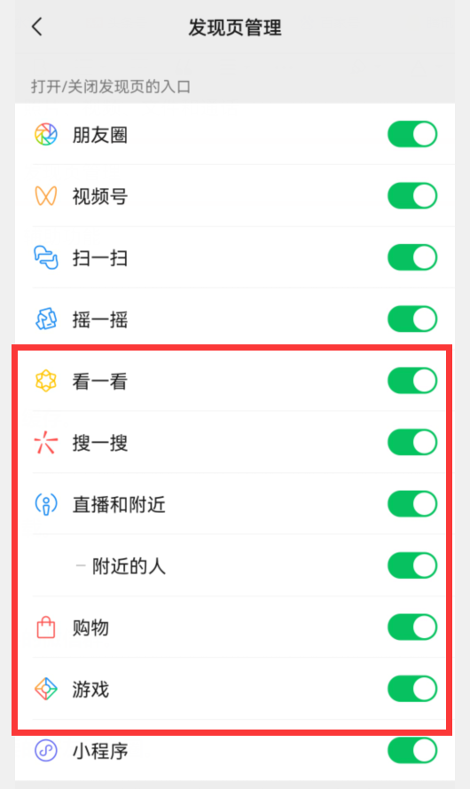 再点击“发现页管理”,就可以看到微信发现页里所有的功能了(如下图)。