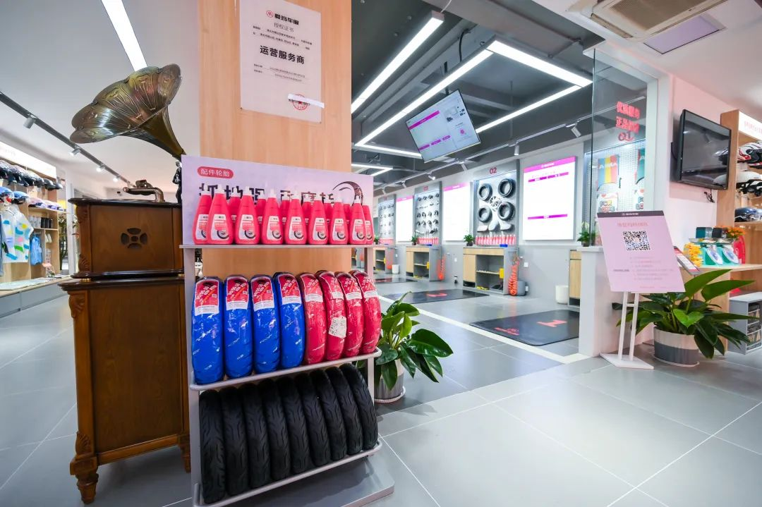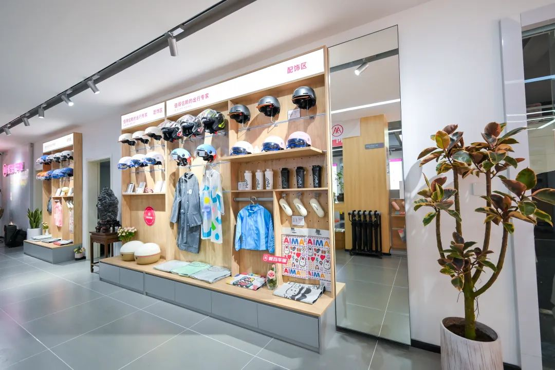 以近年来持续推动店面升级的爱玛电动车为例,门头更加简约醒目、店内科技感满满的现代简约风、技术展示区的模块化设置带来真实的视觉体验,新增品牌形象及IP衍生品售卖区,全新门店为消费者提供更加多样化的增值服务。