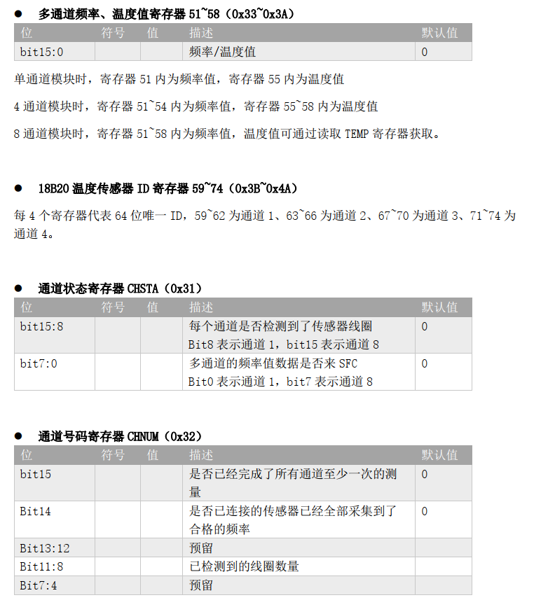 8 通道模块时,寄存器 51~58 内为频率值,温度值可通过读取 TEMP 寄存器获取。