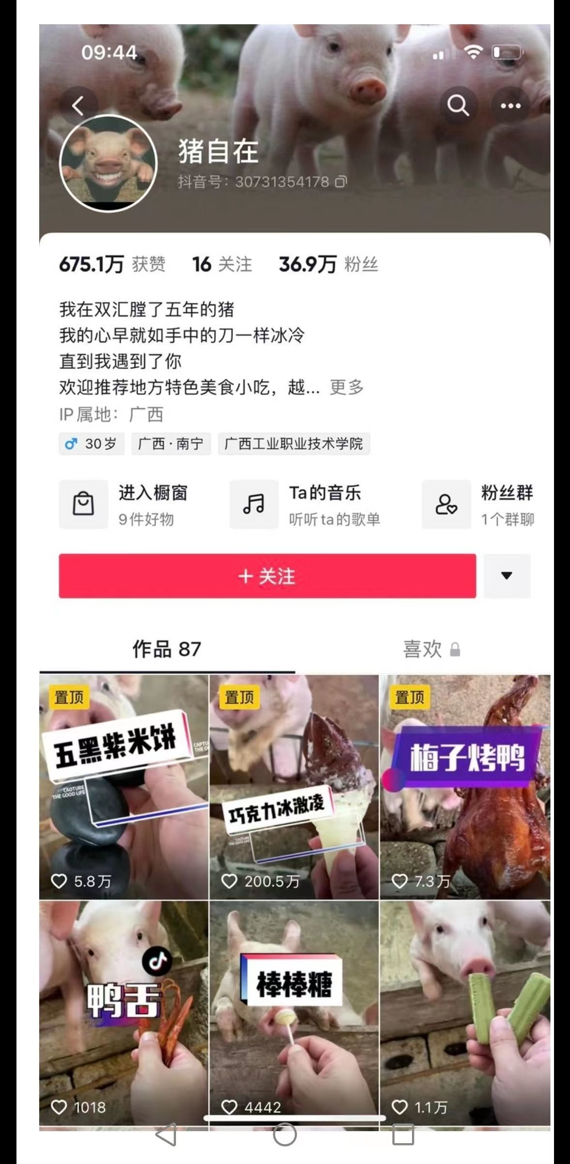 这个账号属于美食+搞笑的结合,每个视频给猪吃好吃的东西。