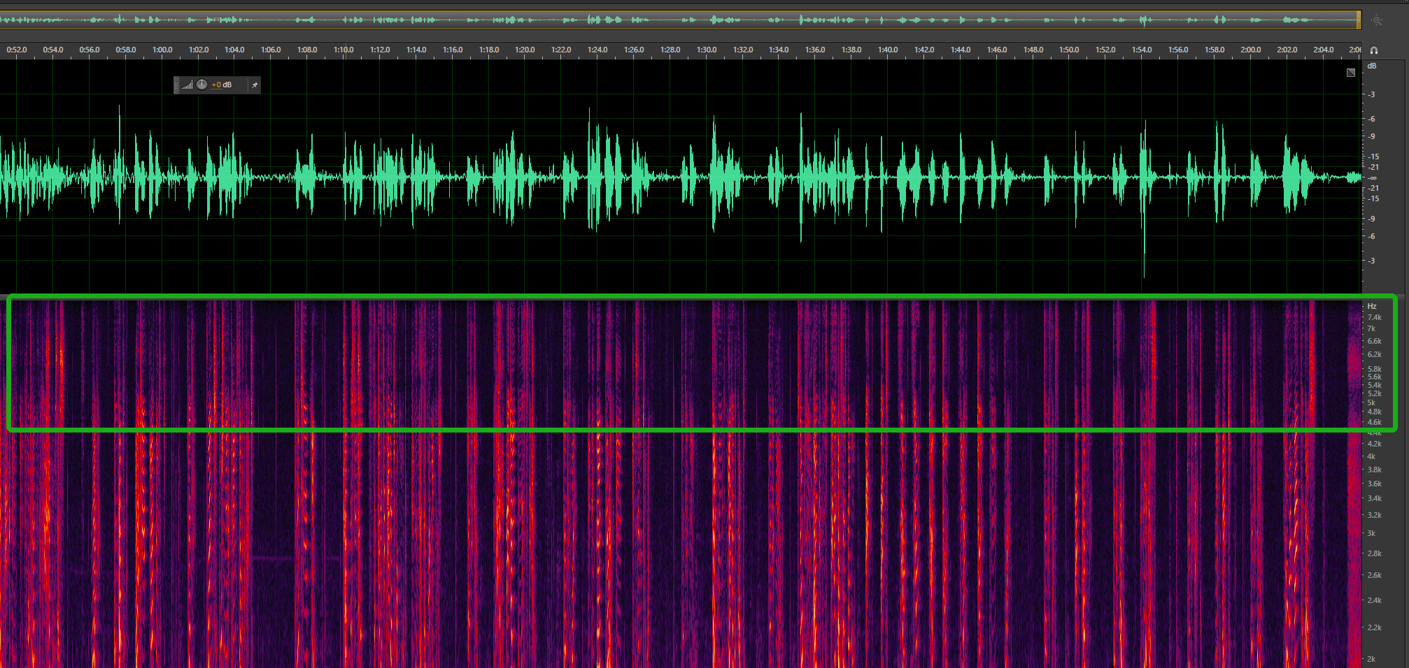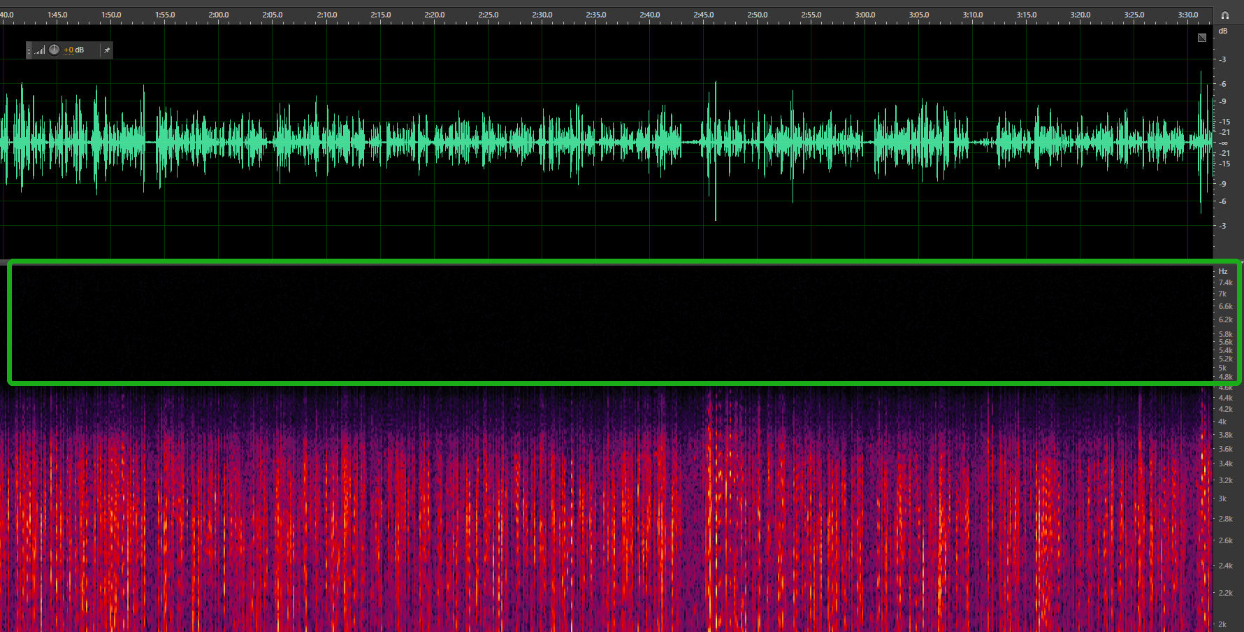 非真正16000Hz(实际为4.6kHz × 2 = 9.2kHz)音频的波形和频谱如下,可以看到在音频在4.6k频段到8k频段信息完全缺失。