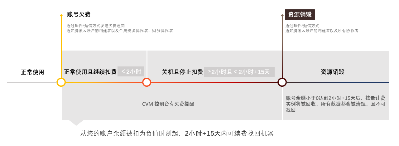 回收机制及 欠费处理 | 若您的云服务器在到期前(包括到期当天)未进行续费,系统将在到期后约48小时内对其作停服处理(设备隔离不关机,仍保留数据),云服务器进入回收站。 | 从您的账户余额被扣为负值时刻起,云服务器在2小时内可继续使用且继续扣费,2小时后服务器将自动关机且停止扣费,云服务器进入回收站。 ![]() |