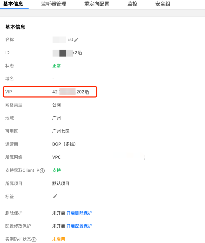 域名:PORT 地址为:lb-xxxxx-xxxxxxxxxx.clb.gz-tencentclb.cloud:8080。对于固定 VIP 负载均衡实例,