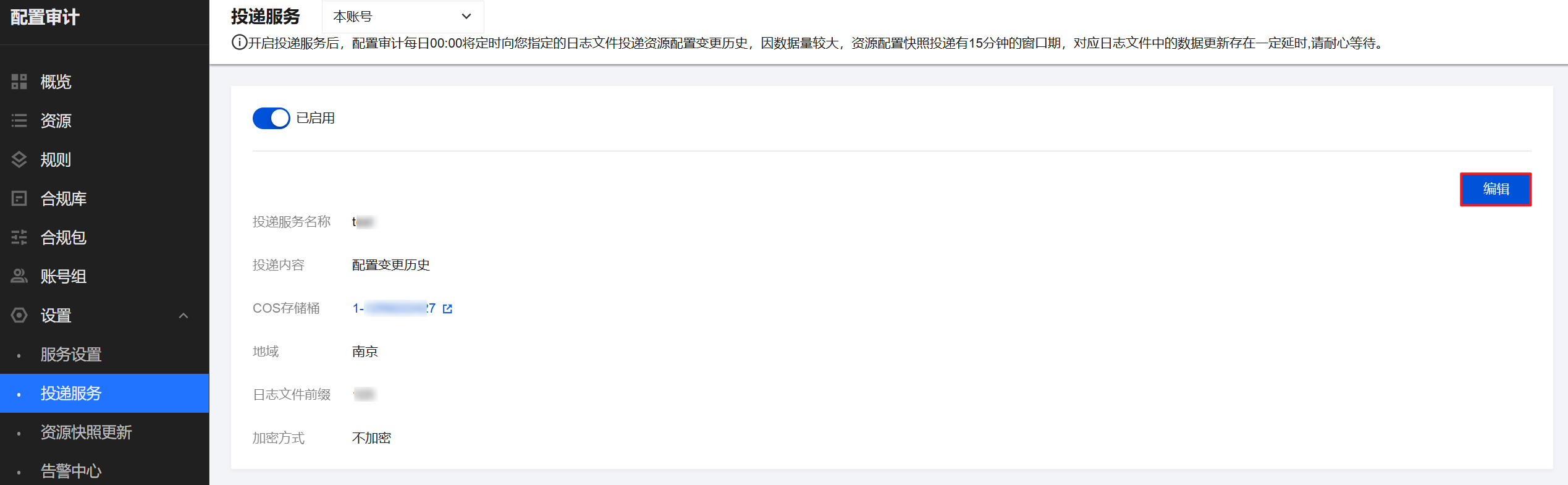 4. 如果您需要对创建的投递服务进行调整:可以使用集团管理员账号进入配置审计 > 投递服务 页面,单击编辑,按需修改相关信息即可。