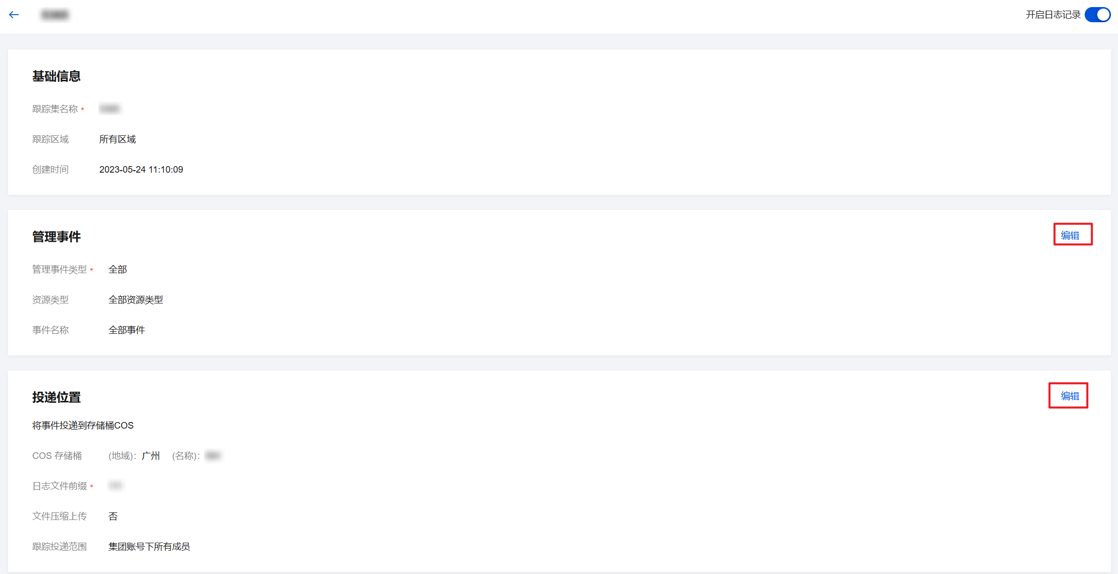 4. 如果您需要对创建的跟踪集进行调整:可以使用创建目标跟踪集的账号进入 操作审计 > 跟踪集页面,选择对应创建的跟踪集,单击编辑,进入该跟踪集详情页面,您可以单击管理事件、投递位置等模块右上角的编辑,按需修改相关信息。详情请参见 设置集团账号跨账号日志投递。