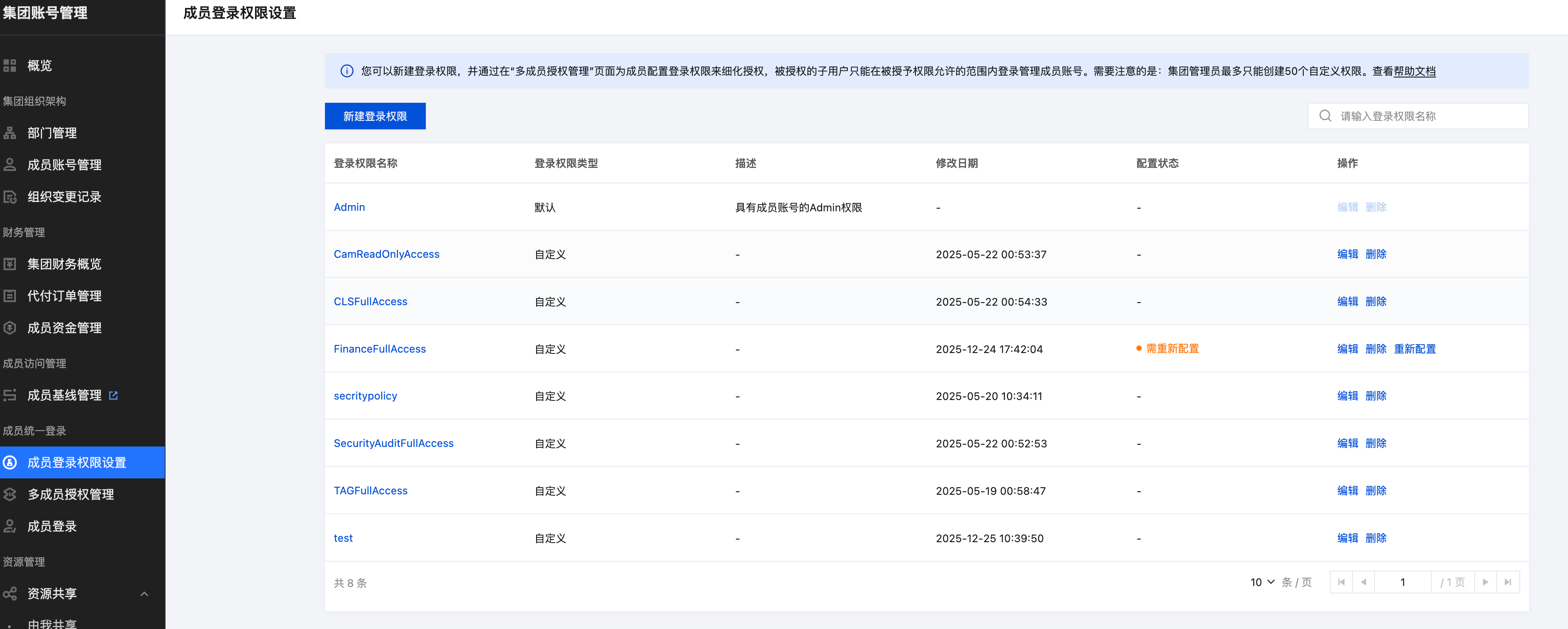 该能力基于集团账号管理的成员登录权限设置,可展示所有用户配置的登录权限信息。