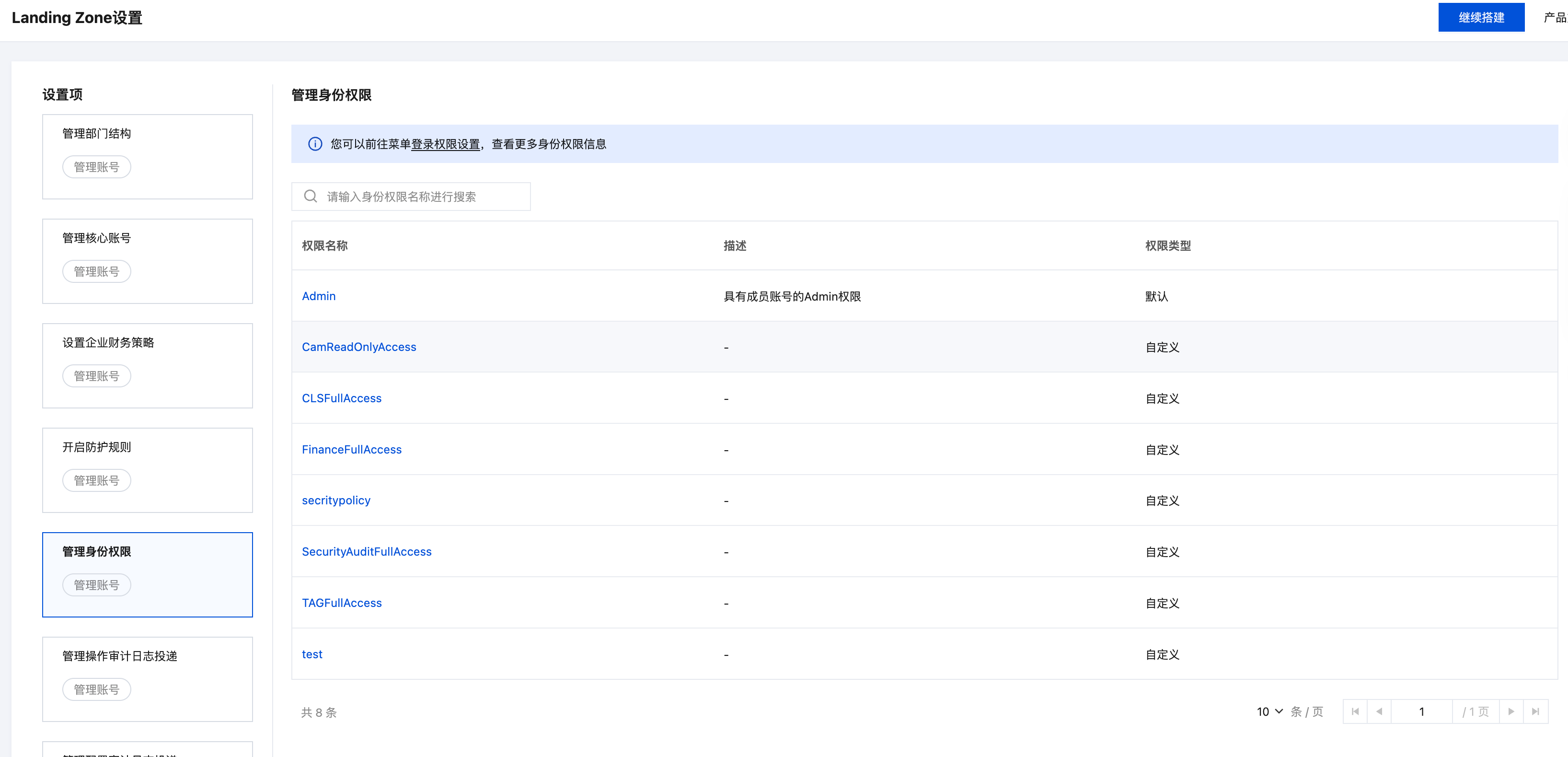 1. 在 Landing Zone 设置 页面可以查看全量登录权限信息,单击权限名称可跳转至集团账号管理的成员登录权限设置页面,您可自主调整绑定策略。详情请参见 管理身份权限。
