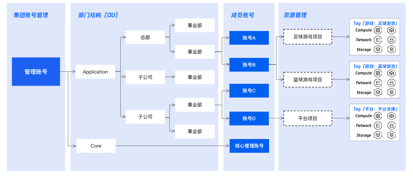 Application(业务账号部门):存放承载具体业务的成员账号。